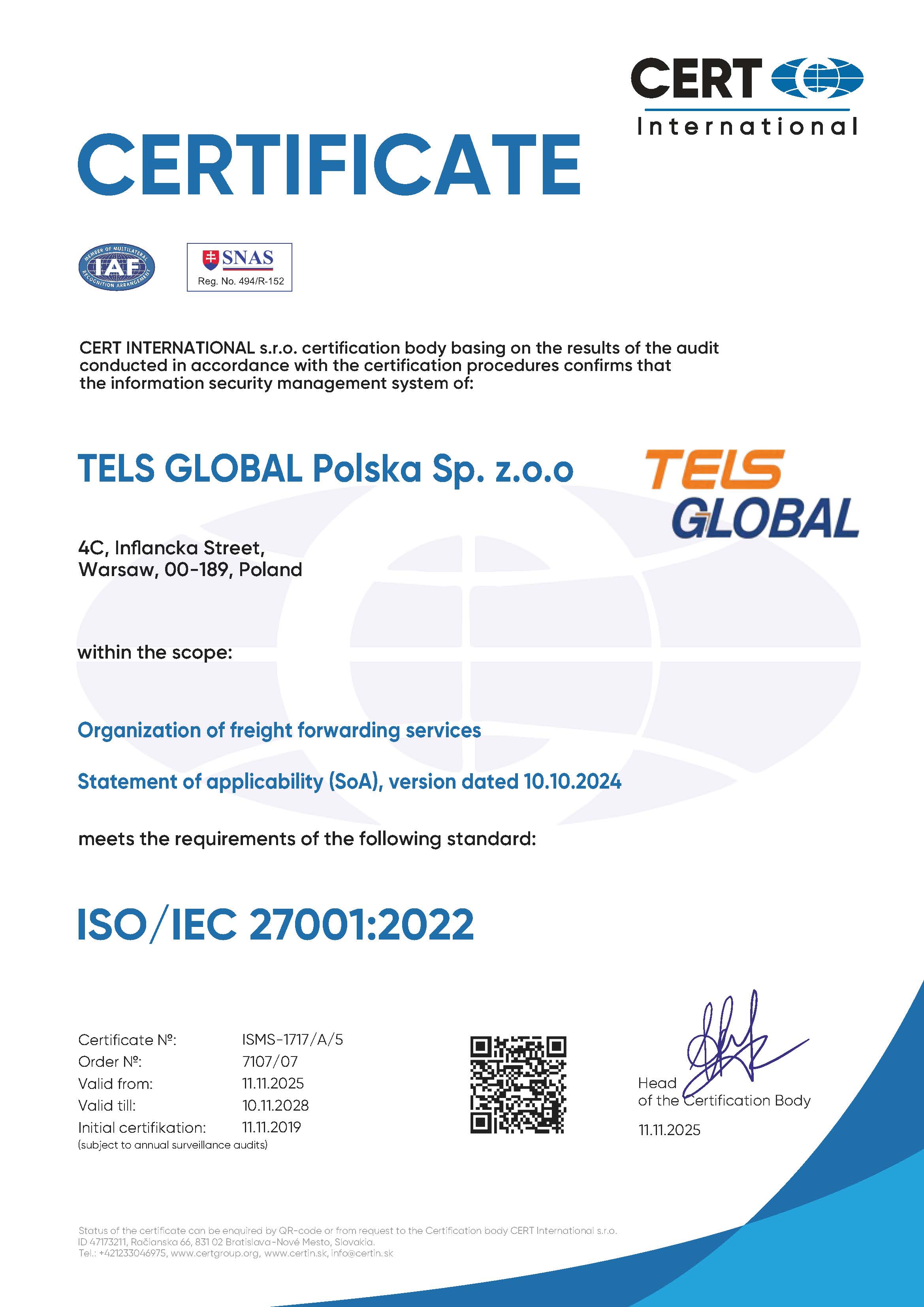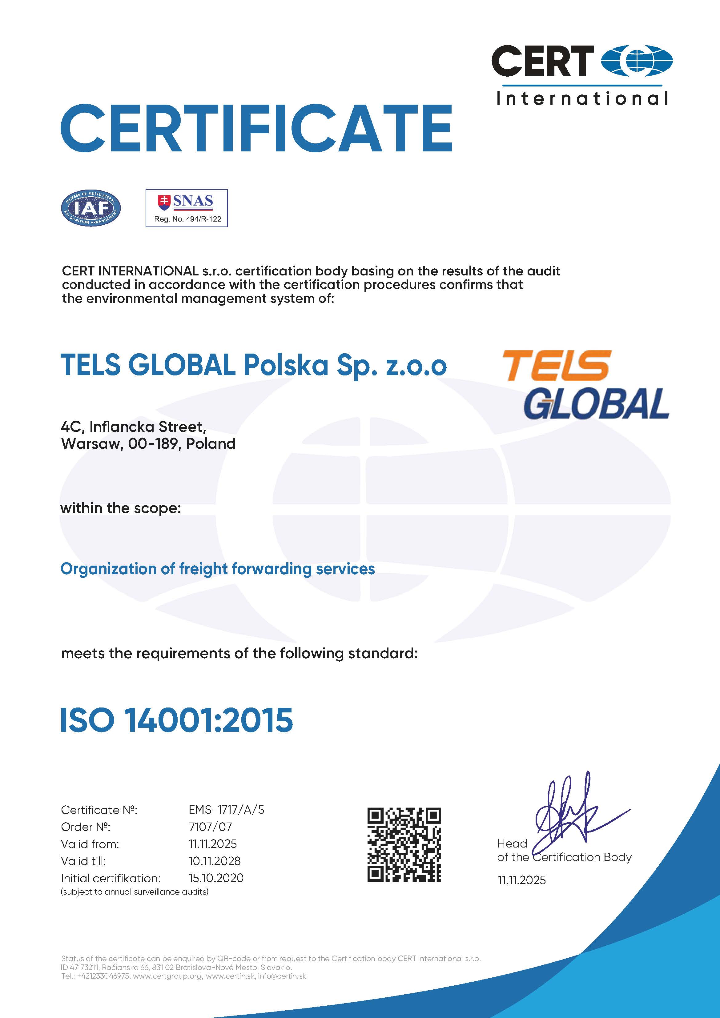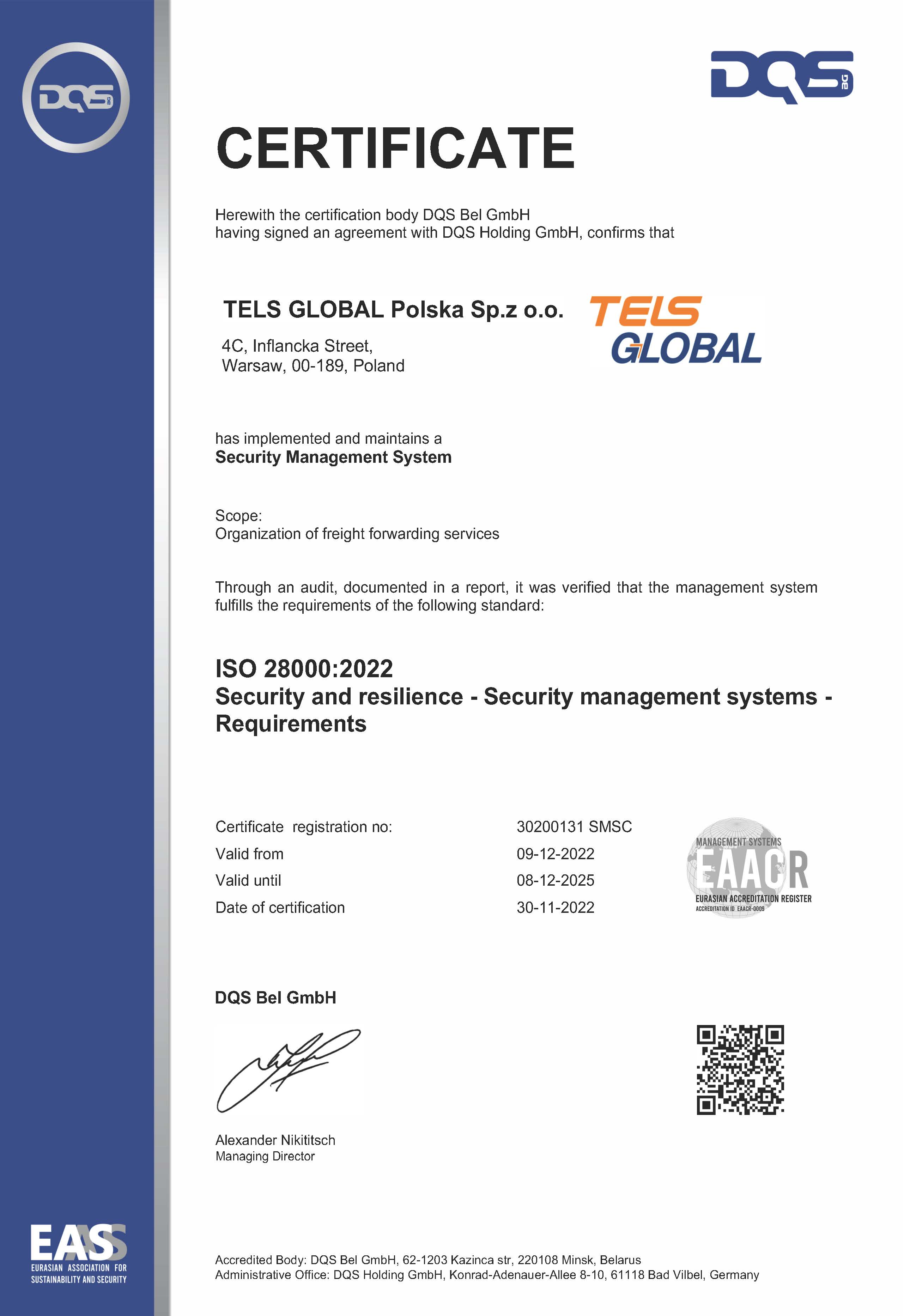 Firma TELS GLOBAL jest pełnoprawnym członkiem najbardziej uznanej Międzynarodowej Federacji Zrzeszeń Spedytorów FIATA. Jakość usług jest potwierdzona certyfikatami ISO 9001, 14001 oraz SQAS.
